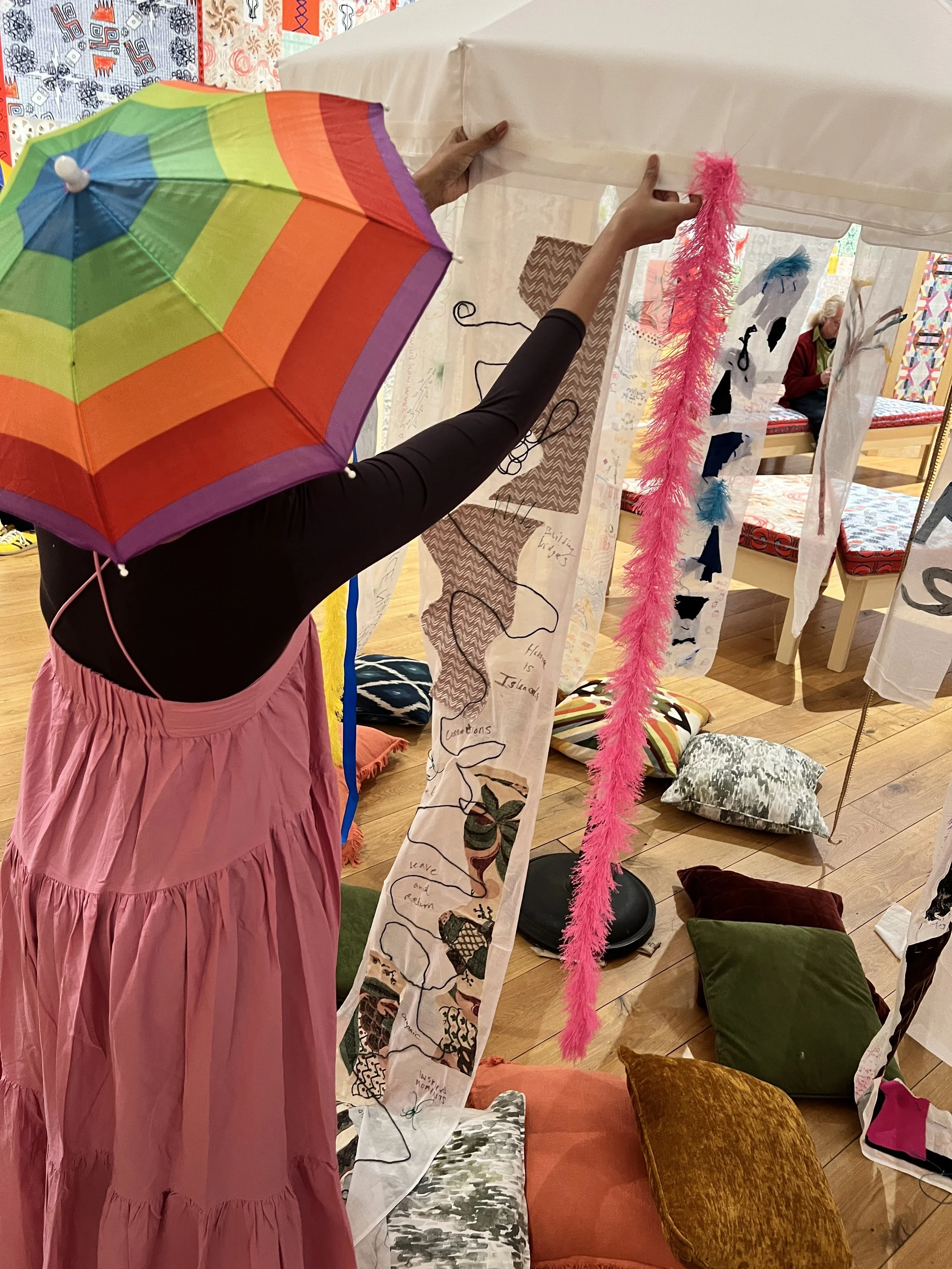 Campervan Collective trio Frankie Fathers, Shruti Gaonkar and Sarah Allen, were invited by multi-disciplinary artist Harold Offeh to create a workshop for the last day of his site-specific installation; The Lounge at Lightbox Gallery, Woking. The trio created a hands-on workshop inspired by H G Wells, where imagination and fabric collided to bring a unique collaborative Textile Time Machine to life.