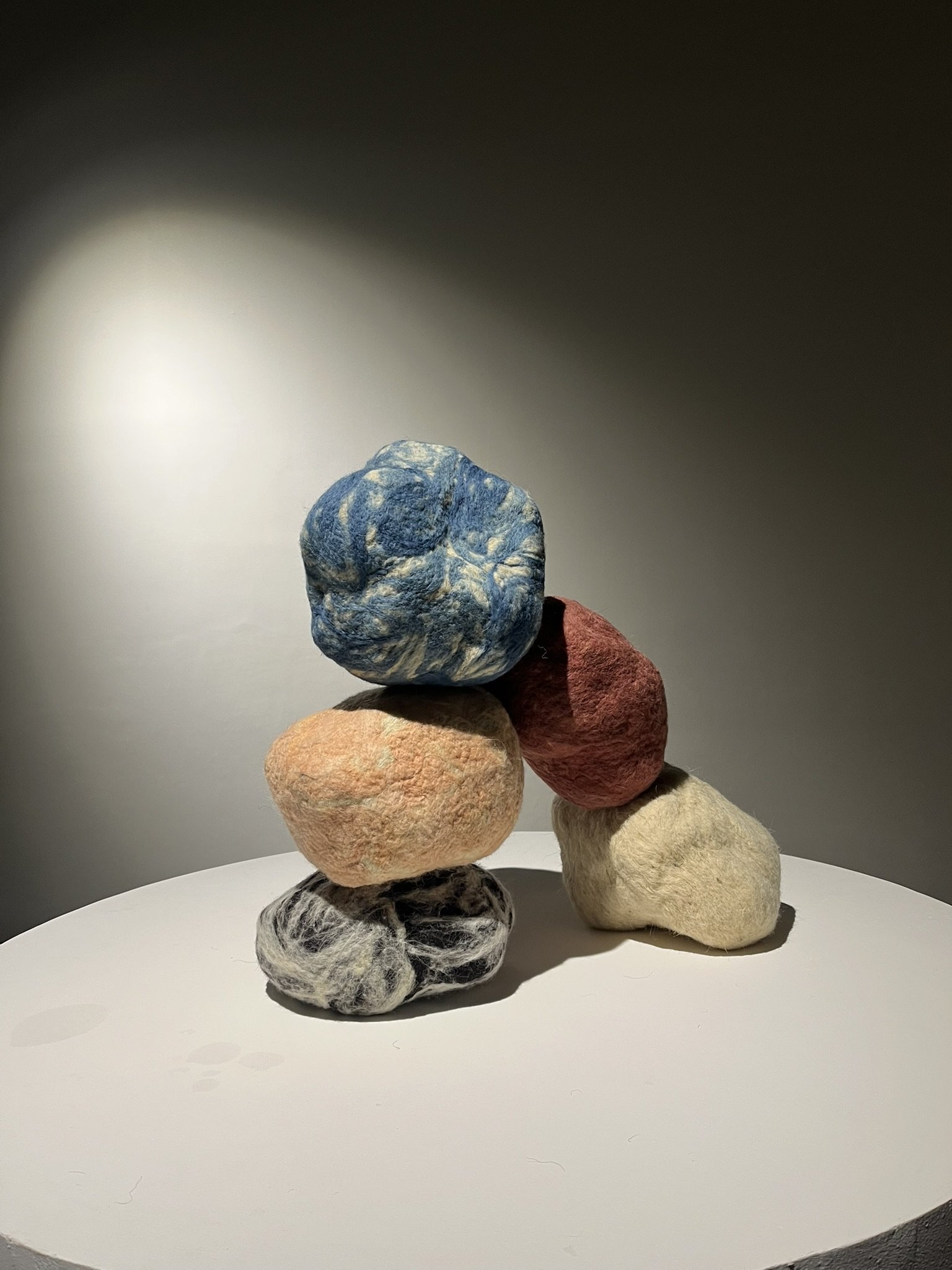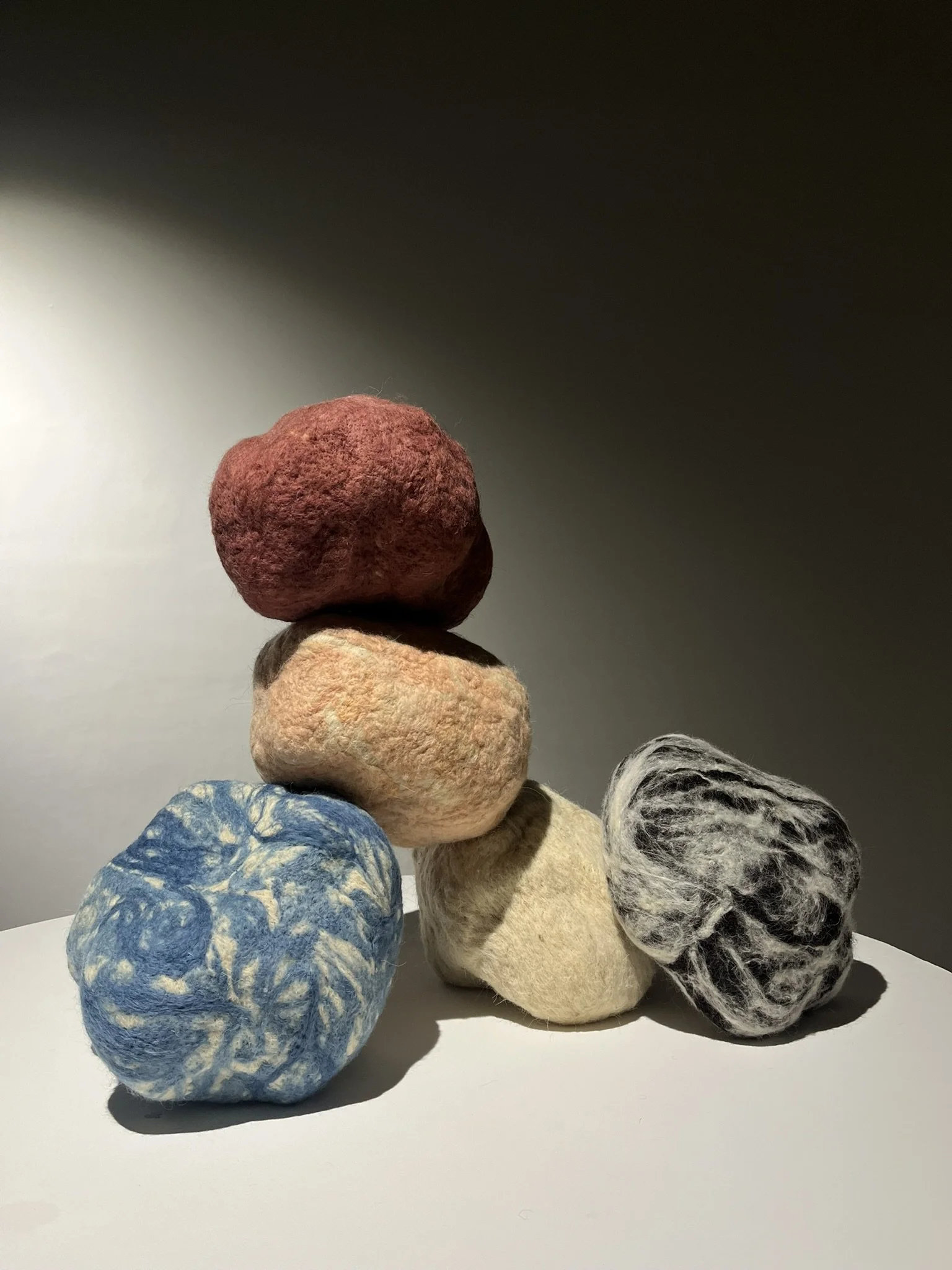 'Boulder Bodies' made by hand dyeing native wool fibres in plant dyes like indigo, madder, marigold and onion skin. Handfelting these inspired by the ancient mythic landscape of Hampi India. These soft sculptures invite play, interaction and whimsical mythmaking.